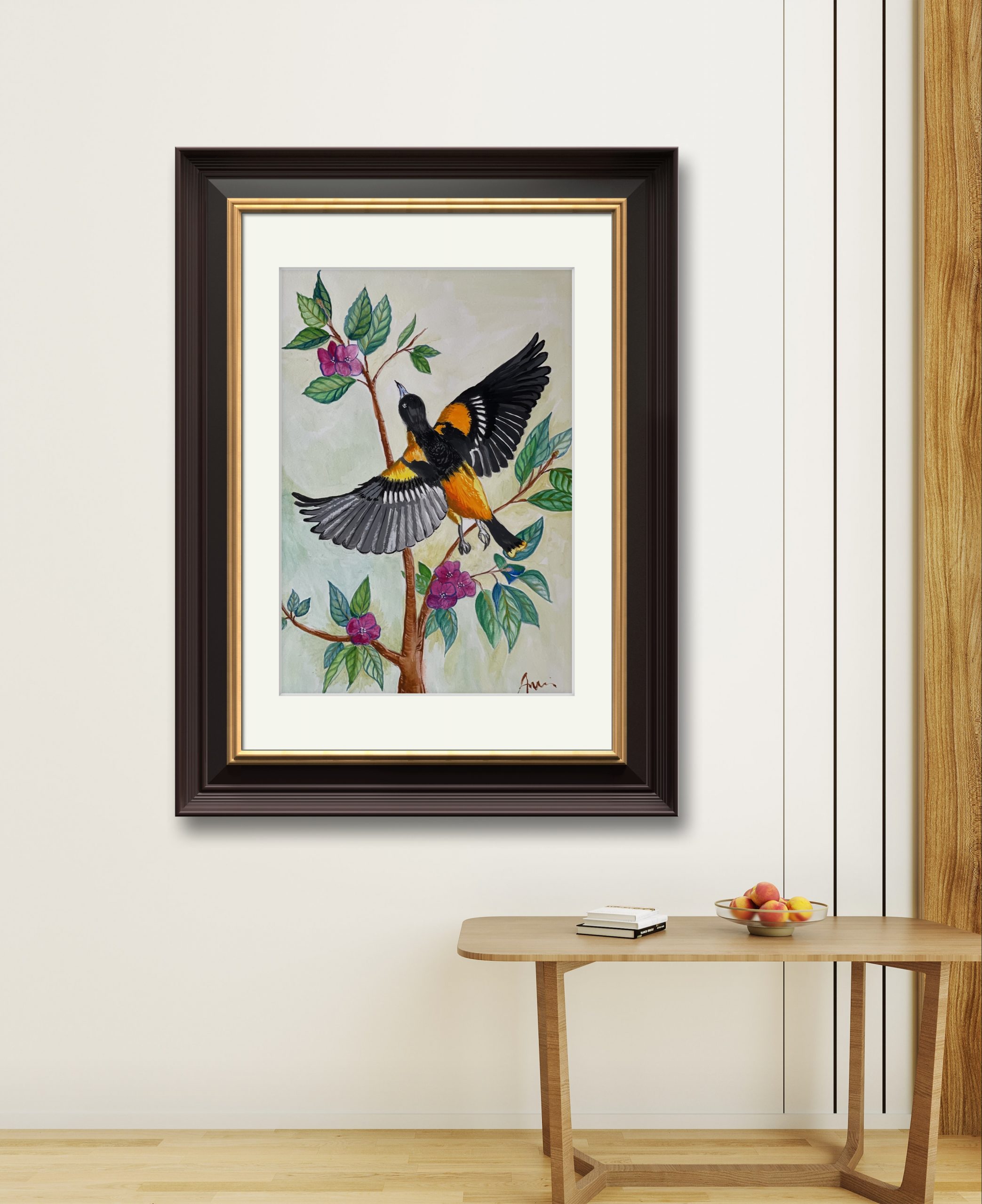 A print of a Baltimore Oriole against a floral background, in Chinoiserie style.