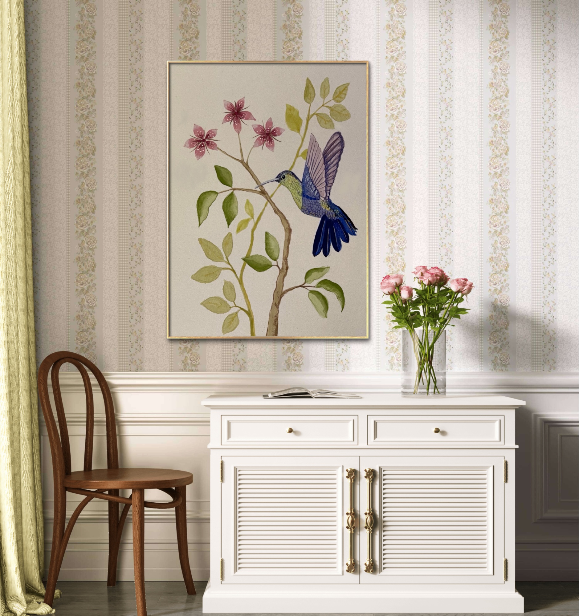 A print of a blue and green hummingbird in Chinoiserie style. This is one of a pair of prints, but you can order this one on its own too.