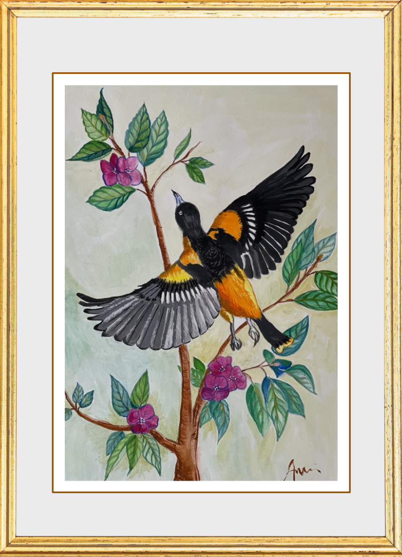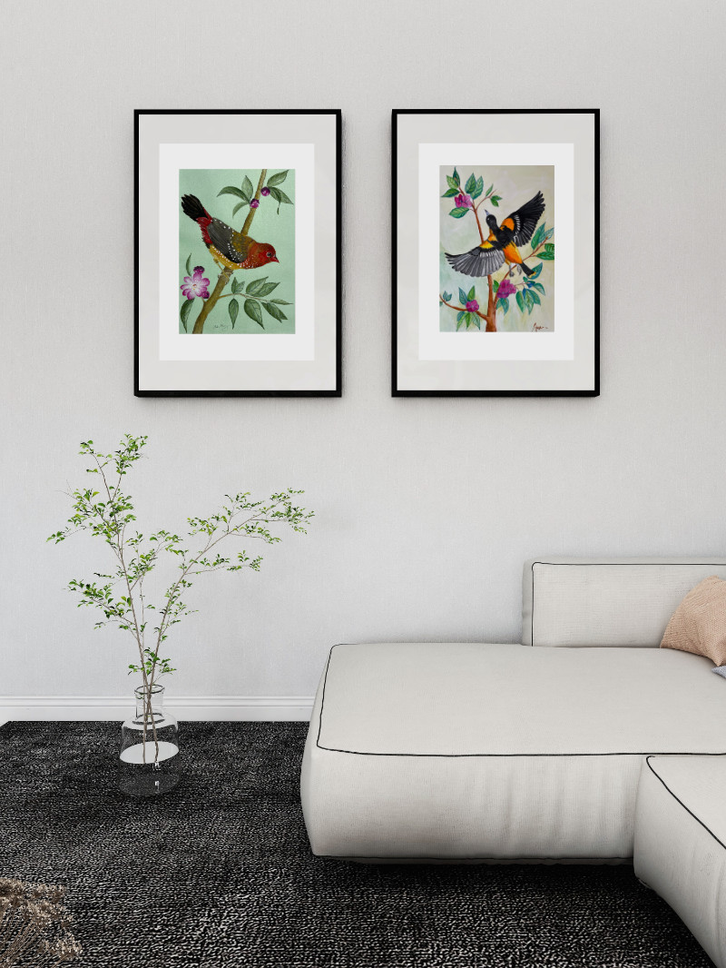 A set of two prints: a Strawberry Finch and a Baltimore Oriole, in Chinoiserie style.