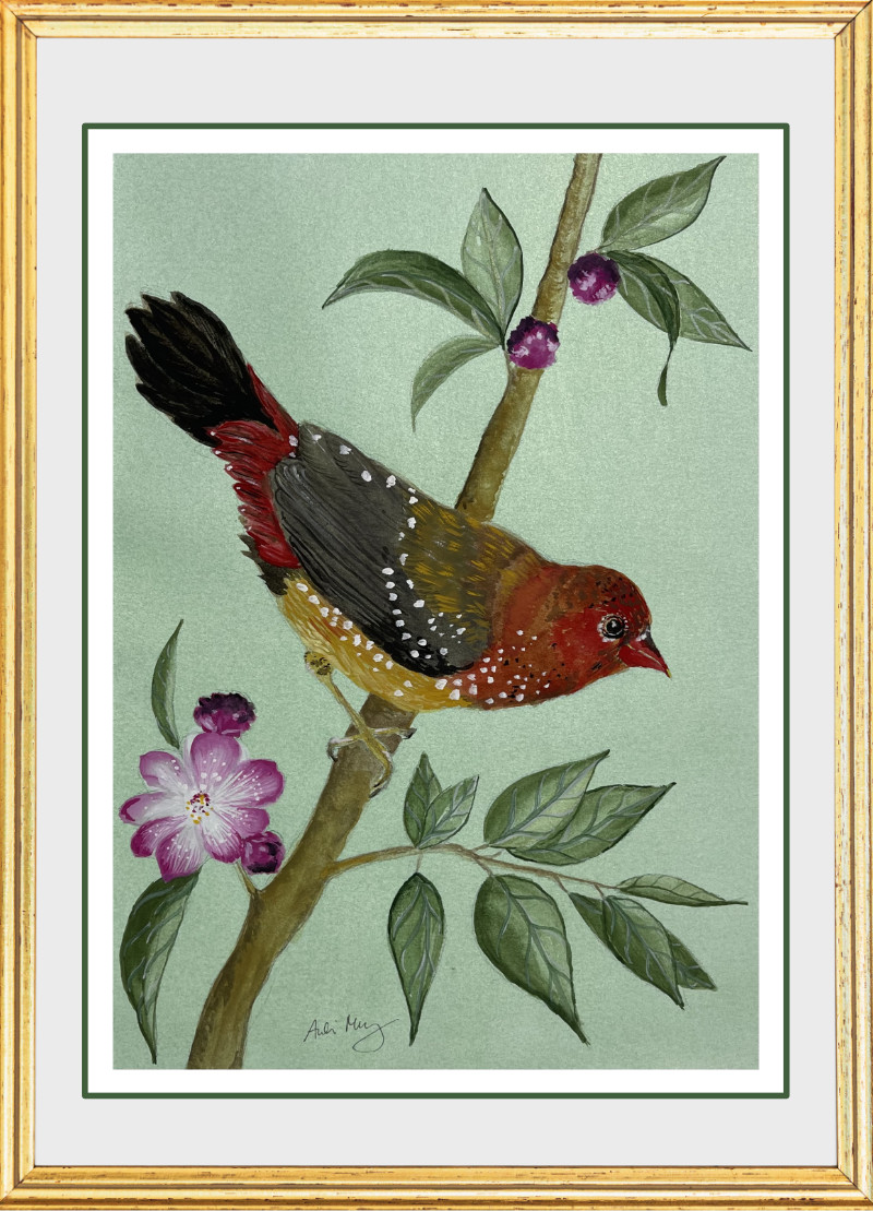 The first is a Strawberry Finch set against a green backdrop, and the second is a Baltimore Oriole in full breeding plumage. The originals were both painted in gouache, on hand-made silk paper.