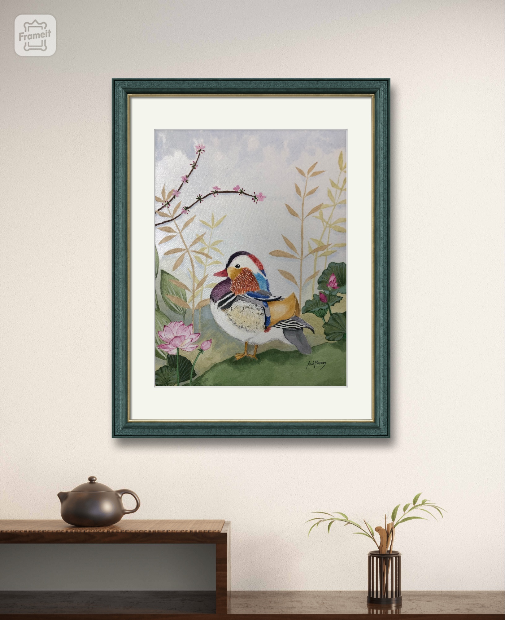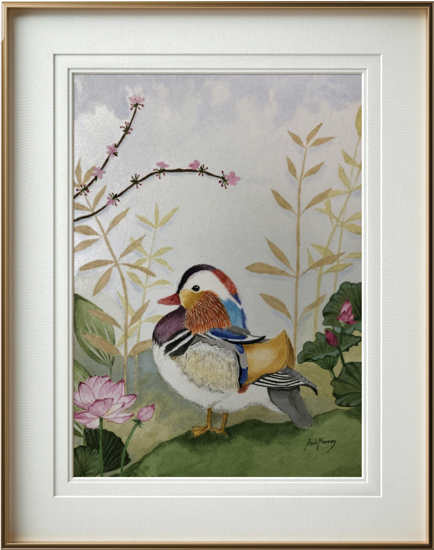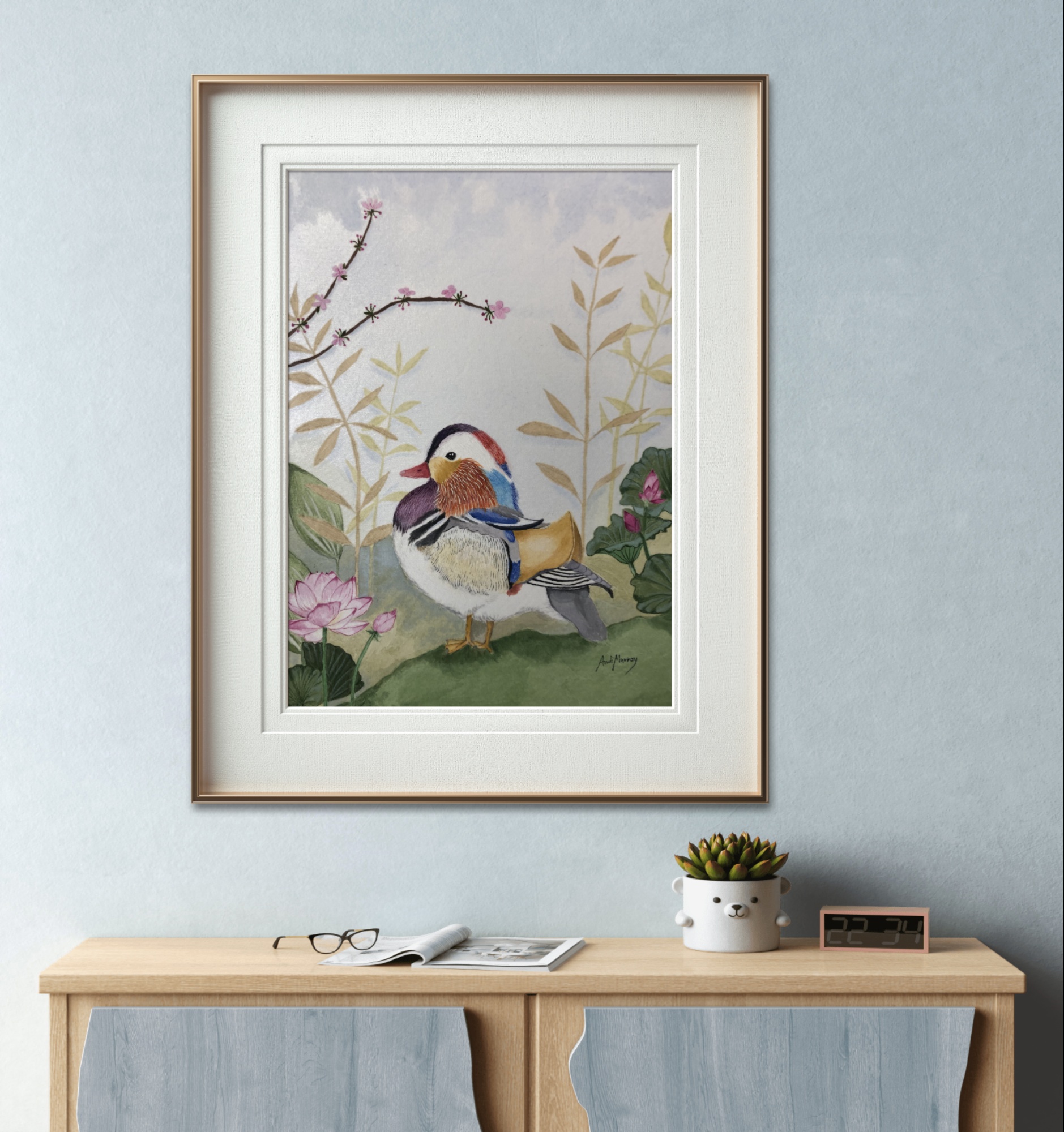 A male Mandarin Duck watercolour in Chinoiserie style, printed on 310gsm paper.